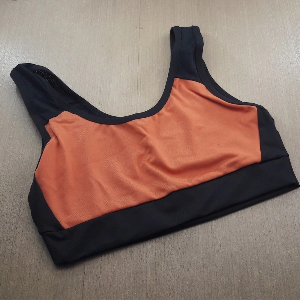 Top fitness bicolor sem bojo. Tela nas alças, abertura acima da barra das costas e forro na frente.